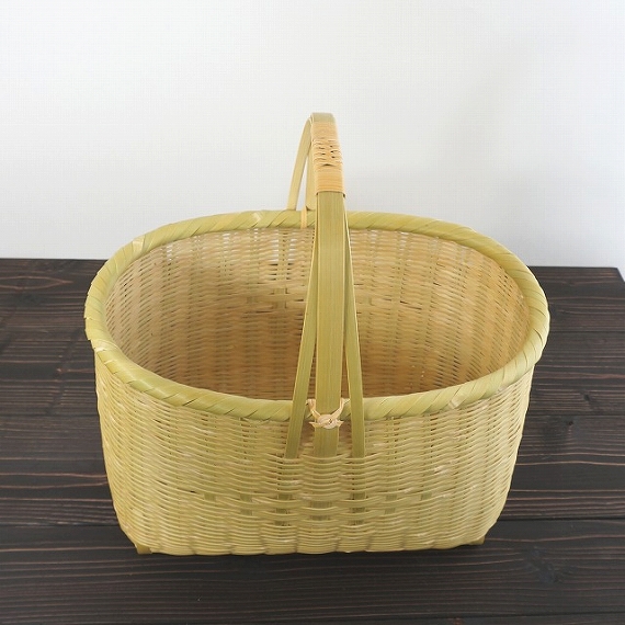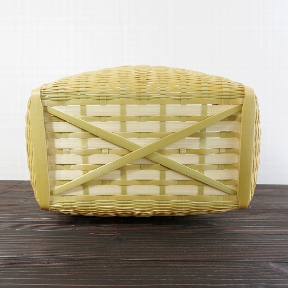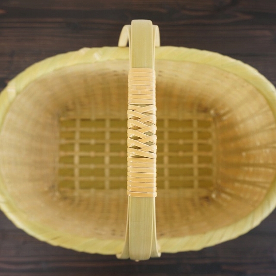 買い物カゴ 筏底 23100円(税込) size:約W37.5cm×D24.5㎝×H23cm (持ち手含むH36.5cm) 素材:マダケ(大分産) 底部分は筏底、胴部分はござ目という編み方で、がっちり編んだ買い物カゴです。 竹の表面は、表皮を磨いており、制作直後の緑色から時間の経過とともに美しい飴色へと変化していきます。