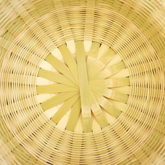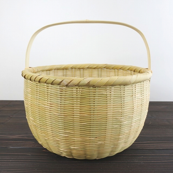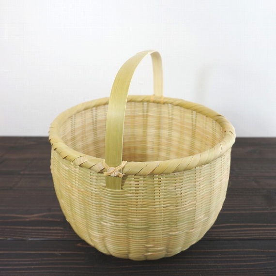 買い物カゴ 菊底 15730円(税込) size:約φ30㎝×H18cm (持ち手含むH29cm) 素材:マダケ(大分産) 底部分は菊底、胴部分はござ目という編み方で、がっちり編んだ買い物カゴです。 竹の表面は、表皮を磨いており、制作直後の緑色から時間の経過とともに美しい飴色へと変化していきます。