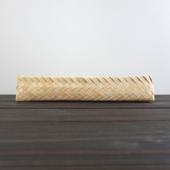 カトラリーケース 3300円(税込) size:約W27cm×D10cm×H5cm 素材:マダケ(大分産) 竹の内側の身竹という部分を使って、 編んだカトラリーケースです。 身竹の白さが、時間とともに飴色に 変化していきます。