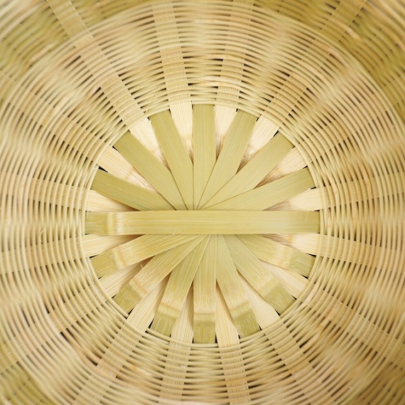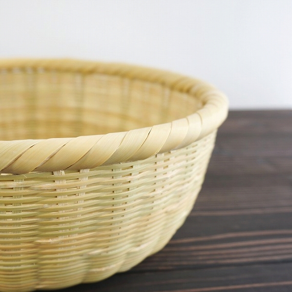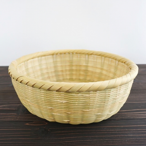 盛りカゴ 1尺 9460円(税込) size:約Φ30.3cm×H10.5cm 素材:マダケ(大分産) 底部分は菊底、胴部分はござ目という 編み方で編んだカゴです。 縁部分も、柔らかい1年目の竹でがっ ちり巻いています。竹の表面は、表皮 を薄く磨いてあるので、時間とともに 美しい飴色に変化していきます。