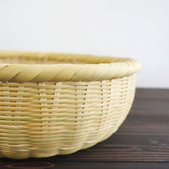 盛りカゴ 9寸 8470円(税込) size:約Φ27.3cm×H9.5cm 素材:マダケ(大分産) 底部分は菊底、胴部分はござ目という 編み方で編んだカゴです。 縁部分も、柔らかい1年目の竹でがっ ちり巻いています。竹の表面は、表皮 を薄く磨いてあるので、時間とともに 美しい飴色に変化していきます。